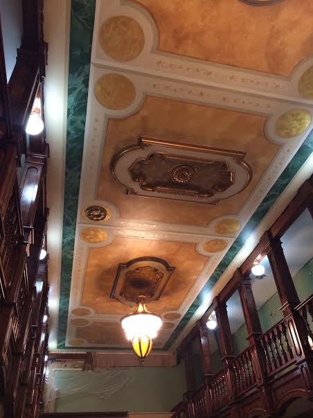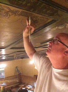 In an undisclosed location, by request of the owner, I have been busily reaching new heights! In a 55,000 square foot venue there are a lot of rooms and ceilings to paint. These are designed to be intricate and historical in nature and can be quite tedious. These three photos show the detail and scale of just a few of the rooms underway.