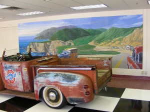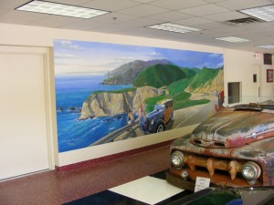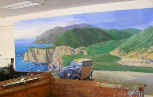 The mural titled ‘California Cruisn’” by Owner Wally Overstreet was installed today. The twenty foot wide painting was originally created on museum grade canvas and mounted to the wall in the new showroom. Tours will begin soon and all will be able to view over sixty classic cars and the two large scale paintings created by Ray Harvey. Overstreet House of Cars is located in Creve Coeur.
