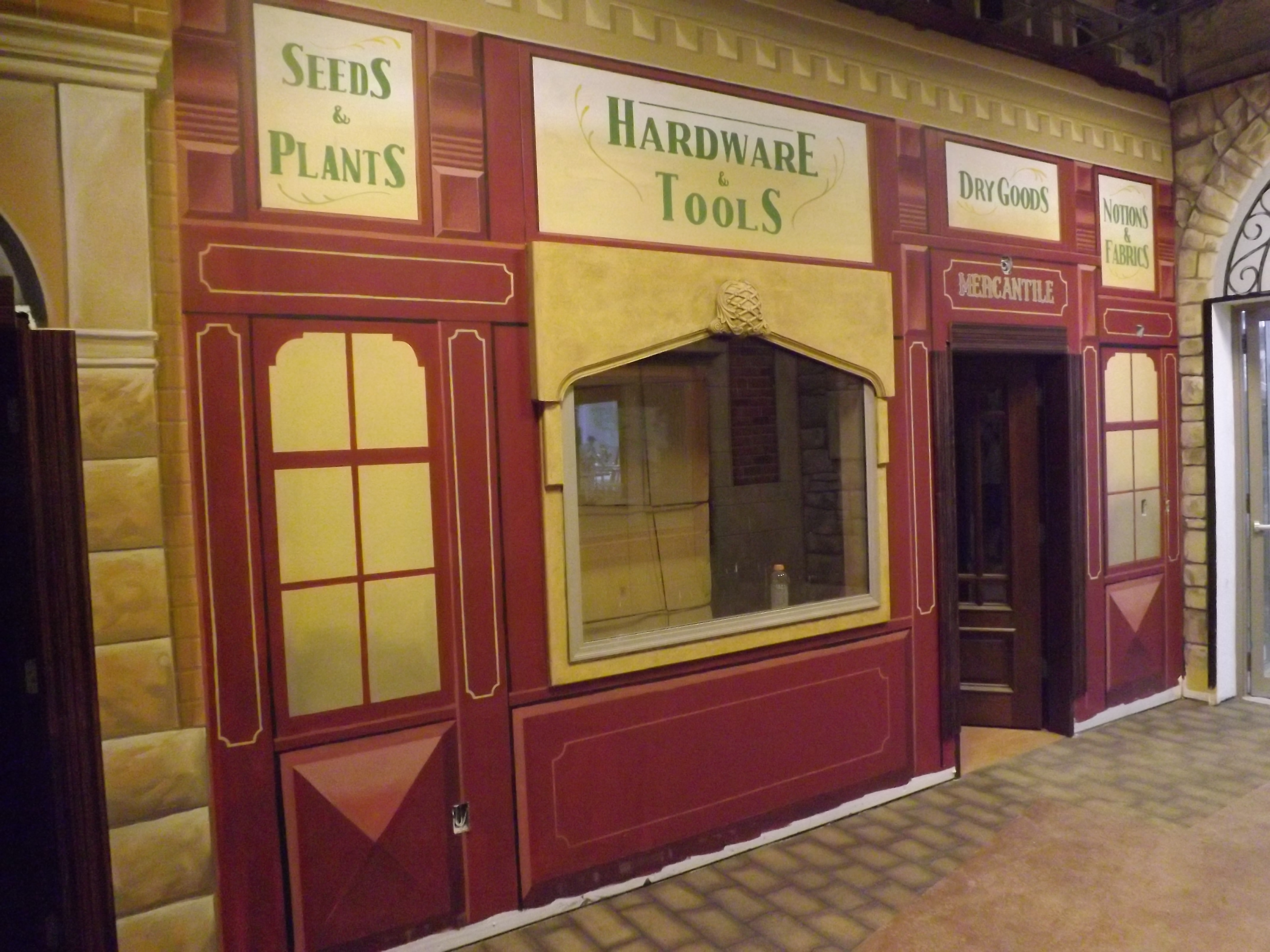 My purpose in being brought into this was to take 15,000 square feet of flat, white walls and turn them into a visual living community. With the use of a creative painting method called Trompe L’oeil I will illustrate the stores, home facades and businesses one would typically see in a small town community. All walls are primed white when I begin. I discuss the basic look of an area with my customer and then do a rough sketch. Once agreed upon I begin to paint. While I usually never use standard wall paint for all of my murals I have chosen high quality finishes from Sherwin Williams for all of this art project. To date the material has met all positive expectations.