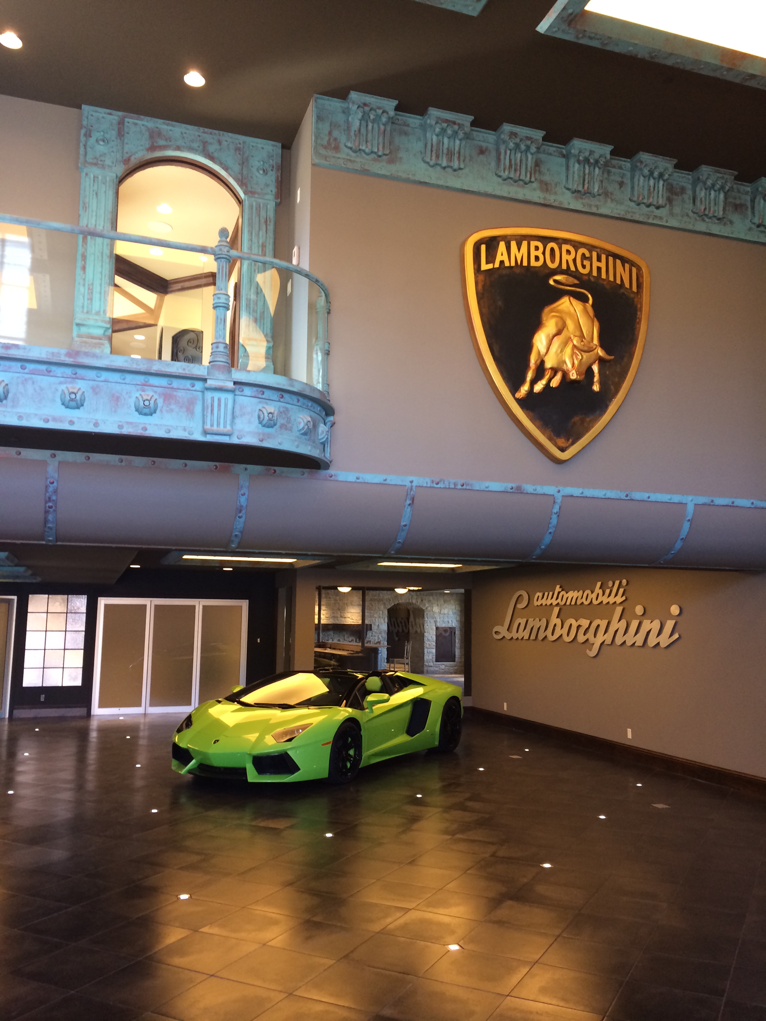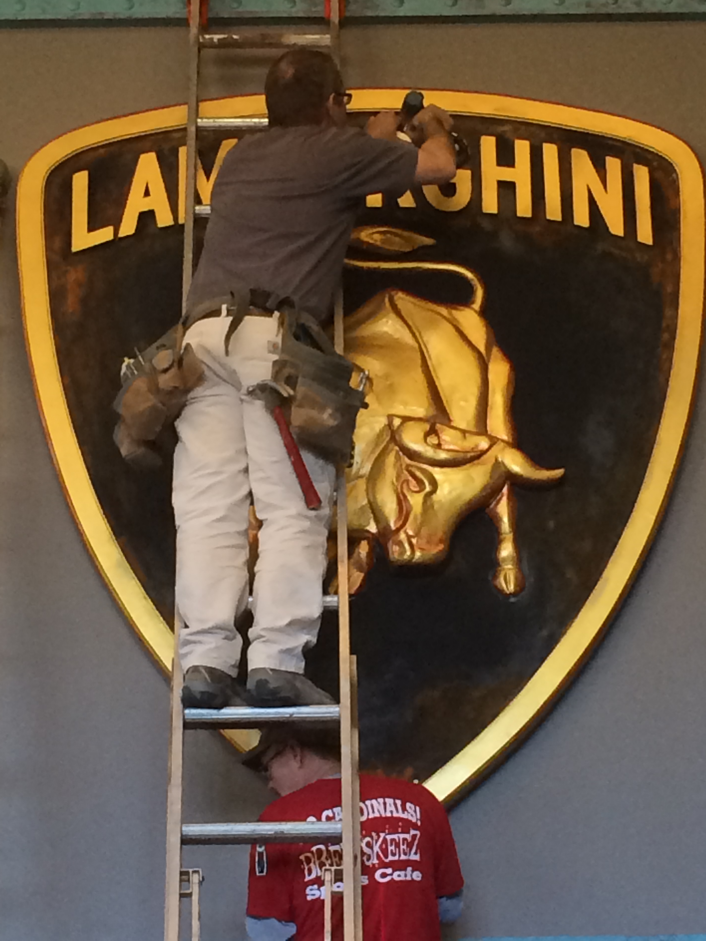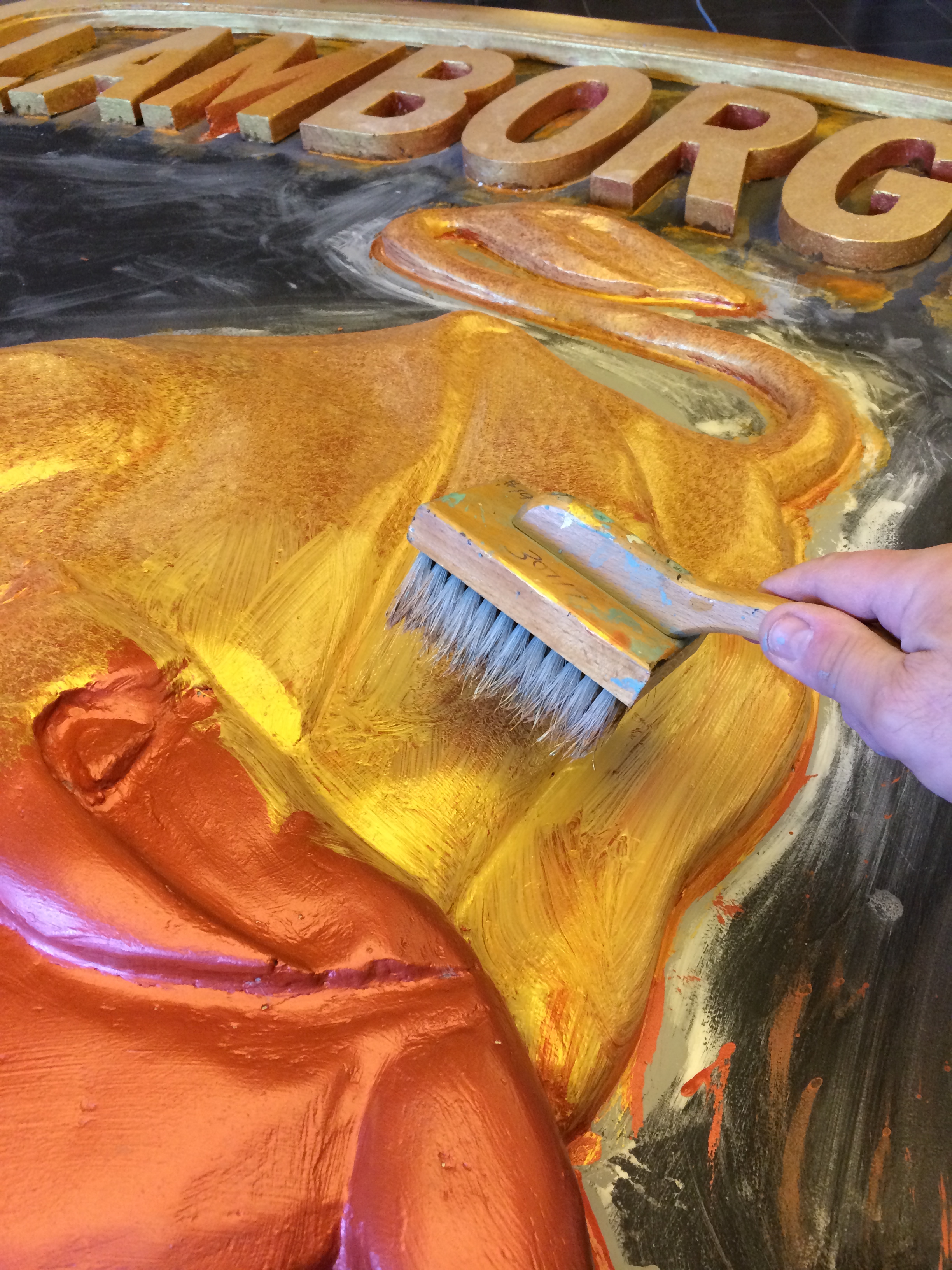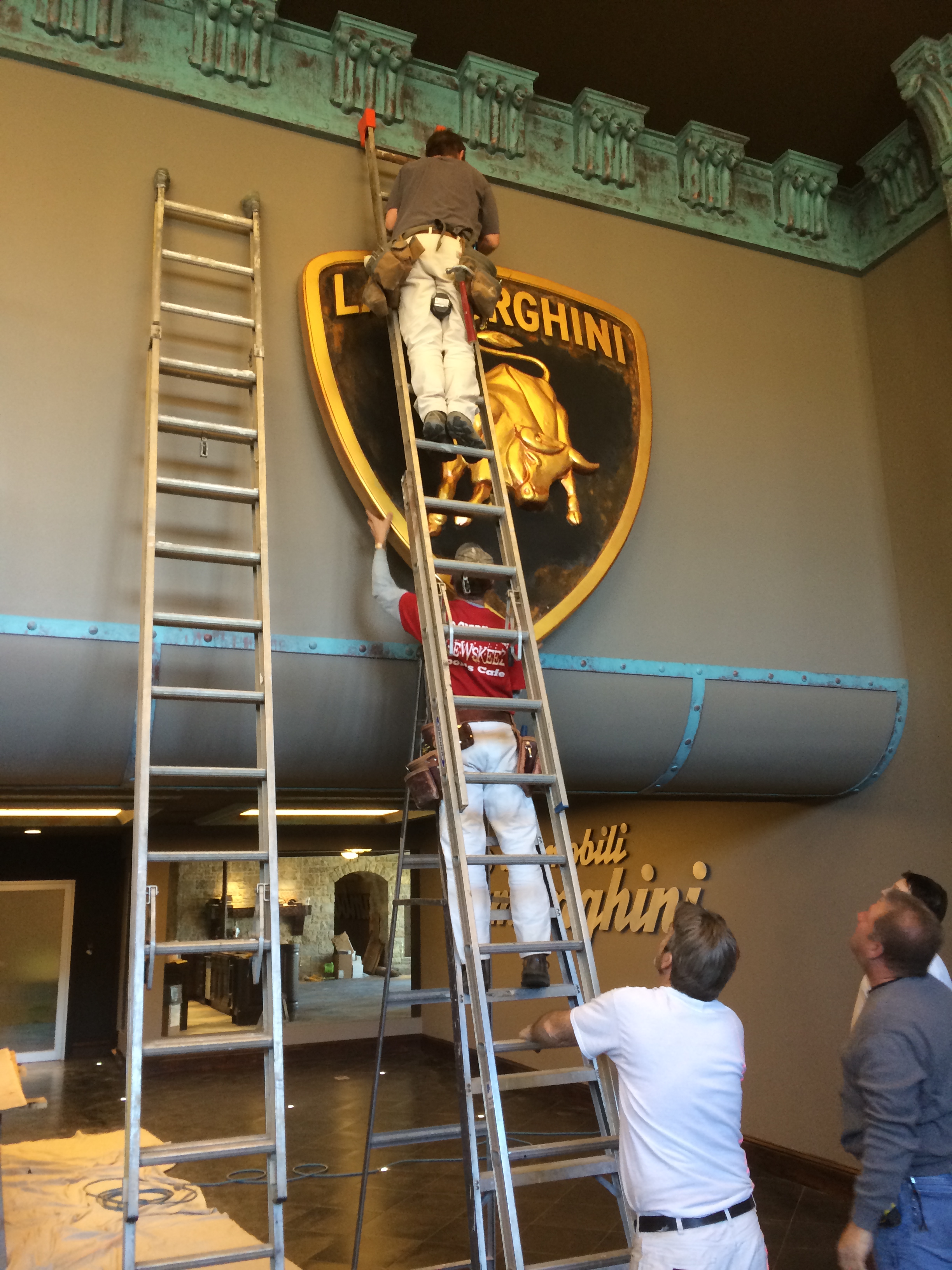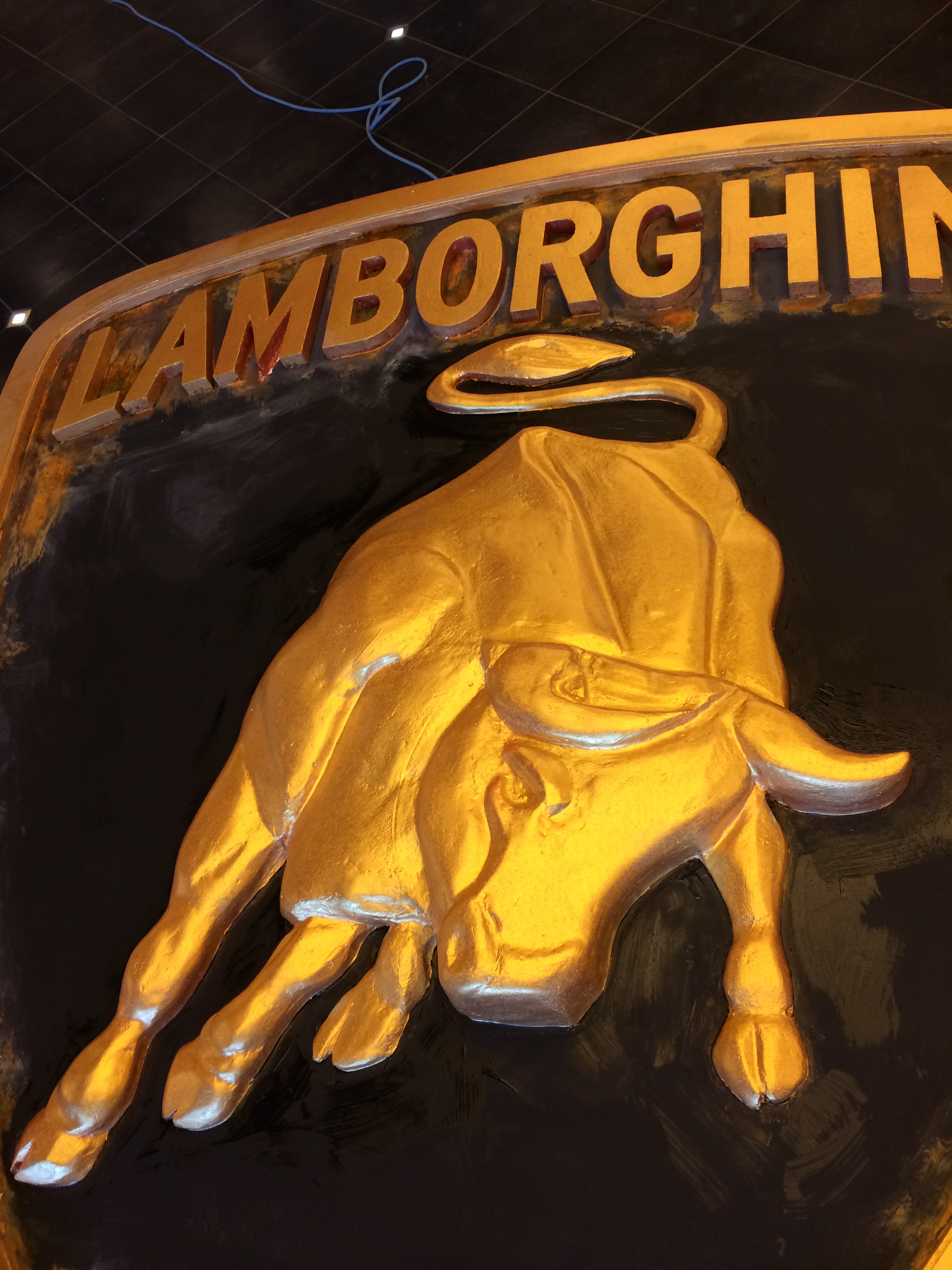 Layers of foam were sandwiched and cut to shape to make the silhouette of the emblem including the letters. It was covered with layers of plaster slurry to give a surface to sand smooth. I then primed and painted the background. a chemical was added to the black to create a rust effect area. I then was given a shaped block of foam for the bull. With a snap-off blade and sanding block I sculpted the Lamborghini signature bull. When shaped and sanding completed I primed and painted the gold leaf finish. The entire process took a little over a week but was finished for his first Lamborghini party with friends in the new space.