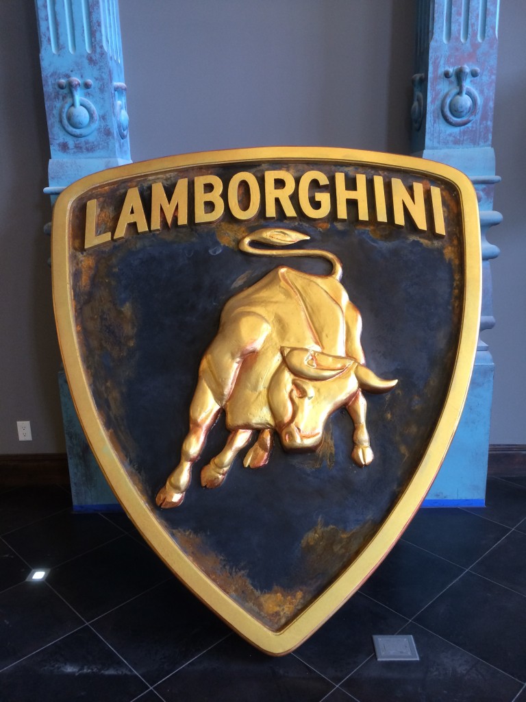 Every once in awhile you’re asked to step out of your comfort zone and create in a different way. This past week my client was in need of a seven foot tall Lamborghini emblem. Since even Lamborghini doesn’t apply them you do the next best thing…call the artist. His desire was to have an emblem to be installed in his car garage/museum that looked as if it was an old metal sign discovered possibly in a Tuscan barn. Getting a custom laser cut wooden emblem produced was out of the question due to schedule and budget. It was decided a more practical decision would be to make it out of styrofoam since it would be seen from a distance and weight would be a factor.